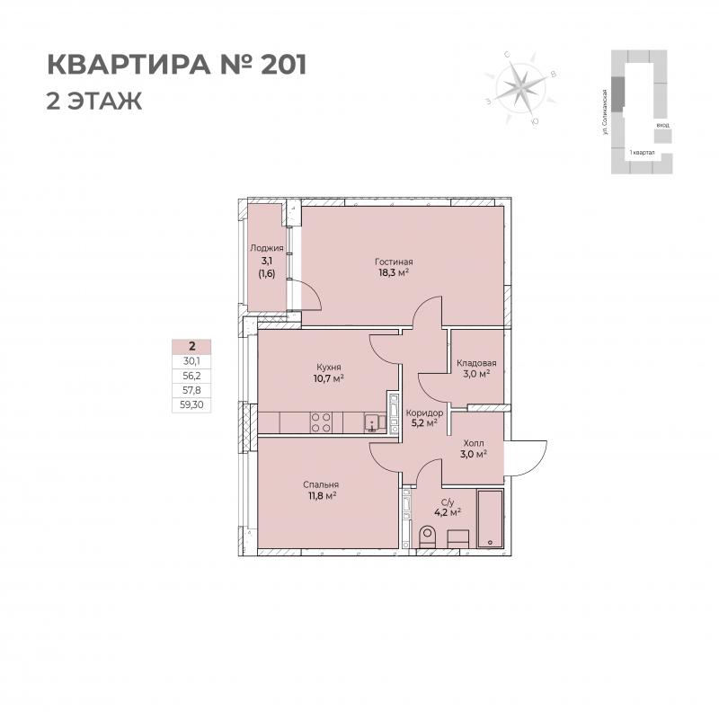 2-комн. квартира, 59.30 м², 2/6 этаж