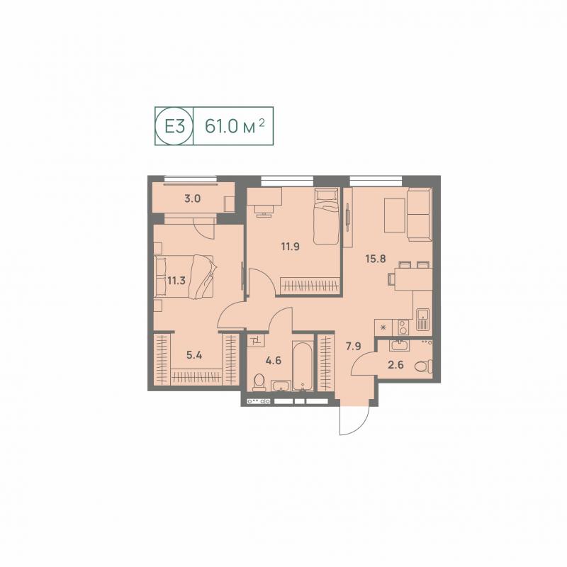 3-комн. квартира, 61.00 м², 14/25 этаж