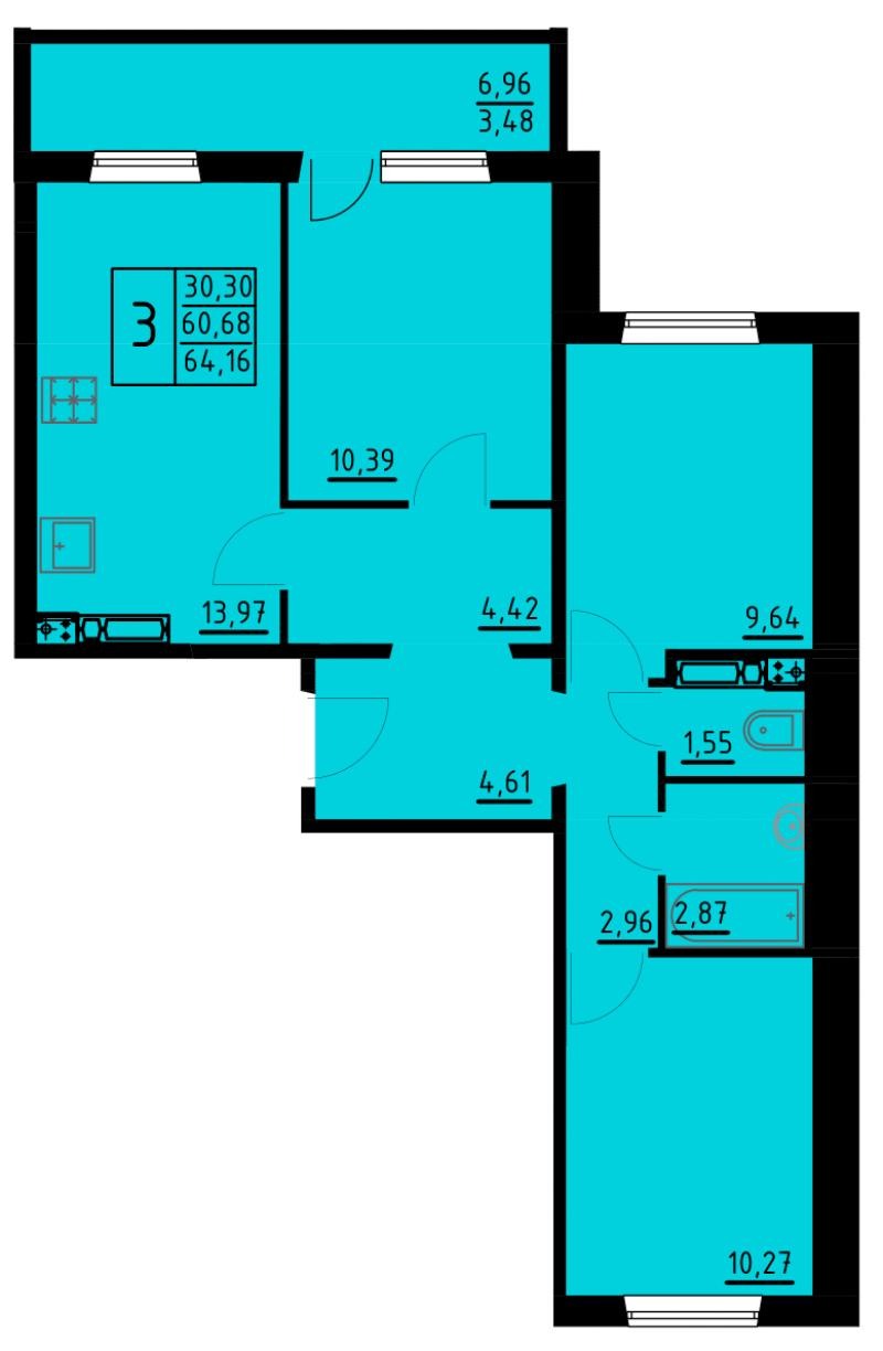 3-комн. квартира, 64.16 м², 2/10 этаж