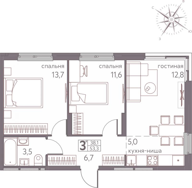 3-комн. квартира, 53.30 м², 10/17 этаж