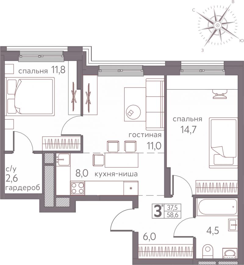 3-комн. квартира, 58.60 м², 2/17 этаж