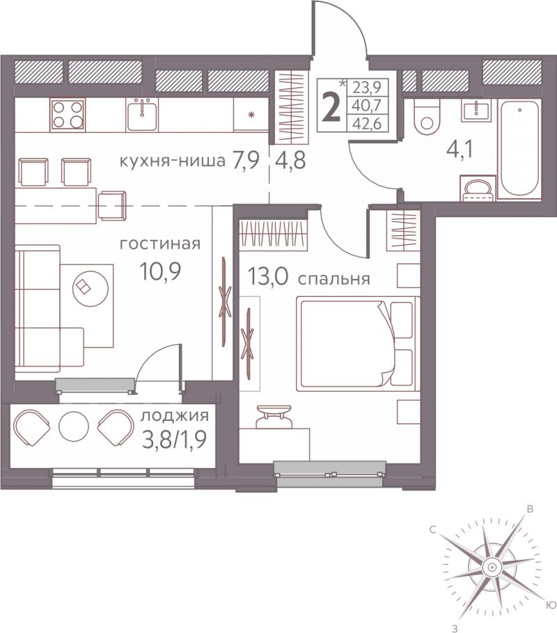 2-комн. квартира, 42.60 м², 10/17 этаж