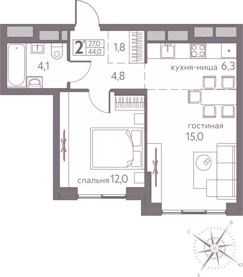 2-комн. квартира, 44.00 м², 8/17 этаж