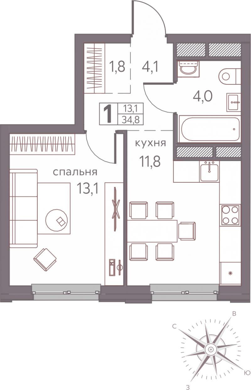 1-комн. квартира, 34.80 м², 7/17 этаж