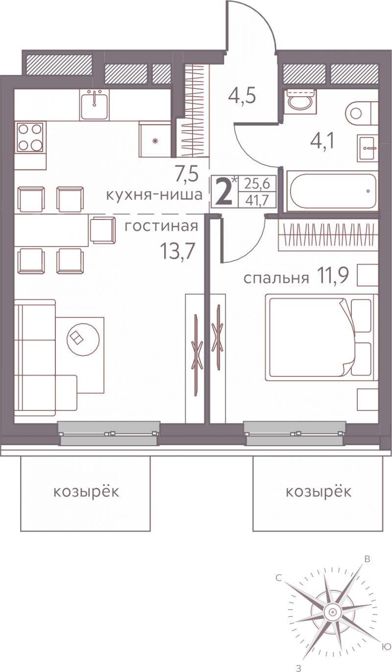 2-комн. квартира, 41.70 м², 2/17 этаж
