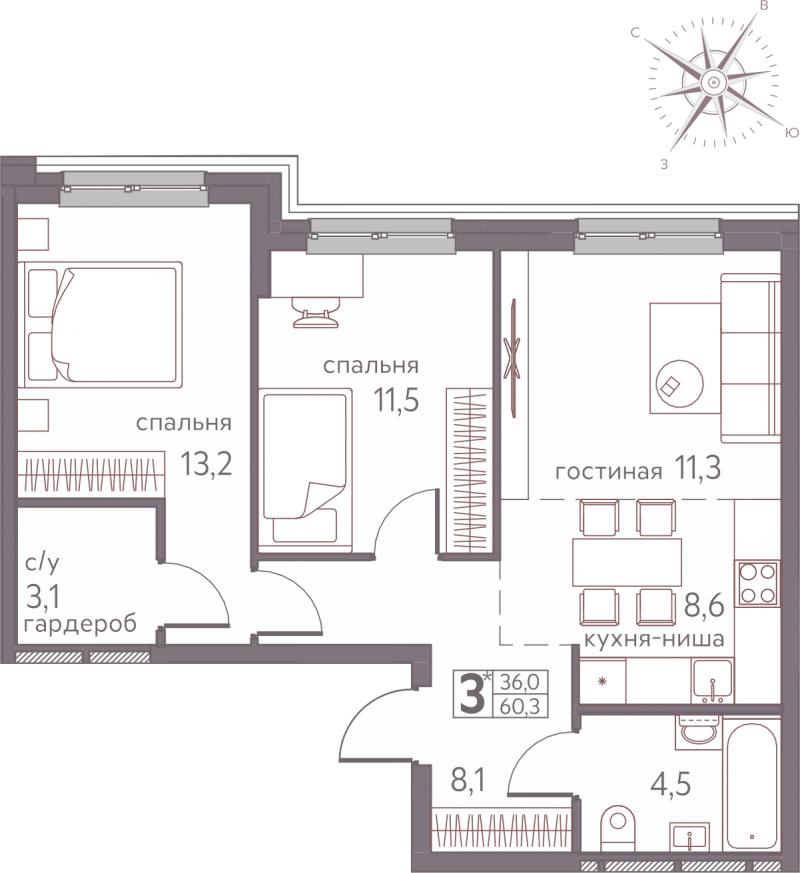 3-комн. квартира, 60.30 м², 2/17 этаж