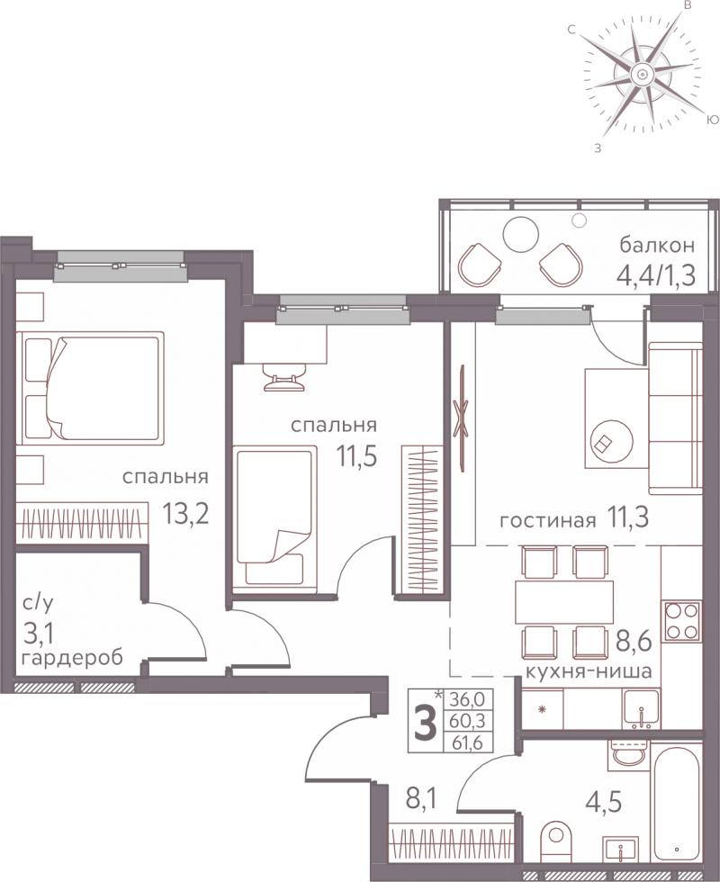 3-комн. квартира, 61.60 м², 6/17 этаж