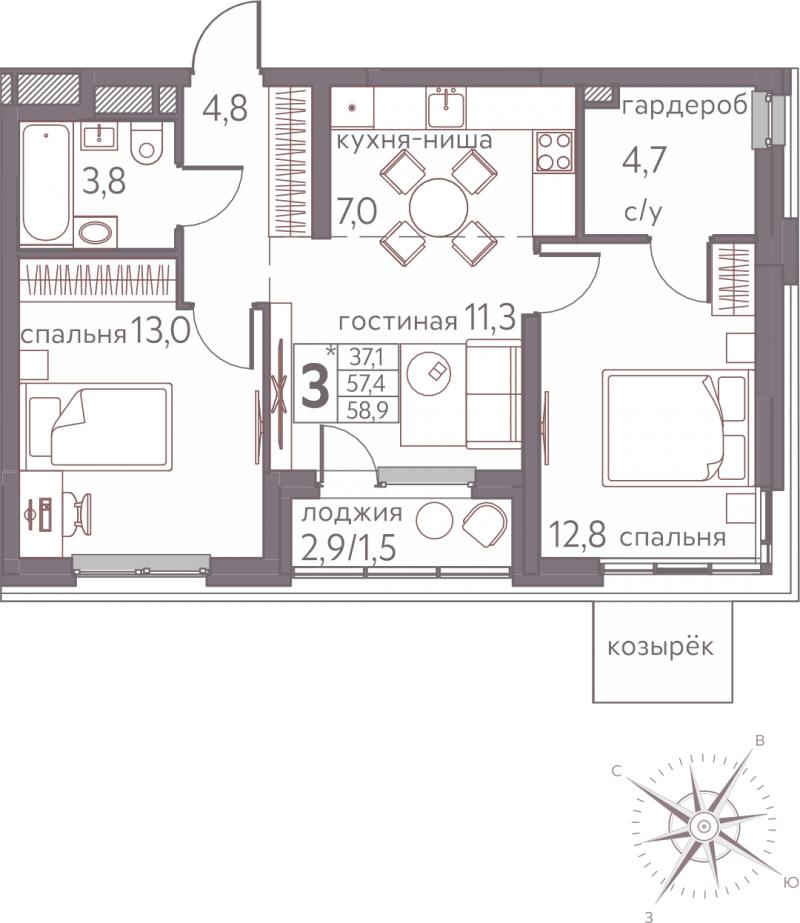3-комн. квартира, 58.90 м², 2/17 этаж