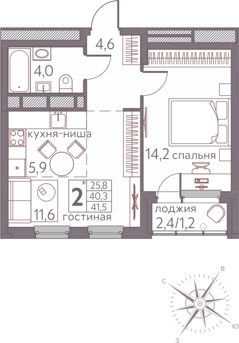 2-комн. квартира, 41.50 м², 12/17 этаж