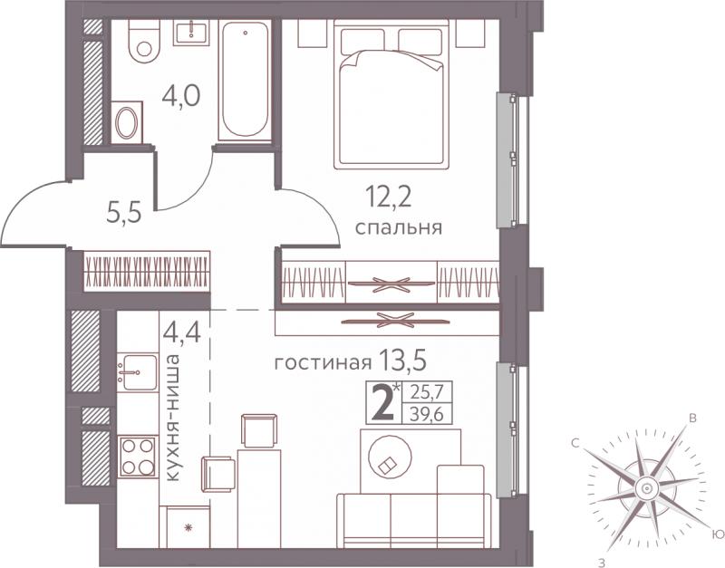 2-комн. квартира, 39.60 м², 11/17 этаж