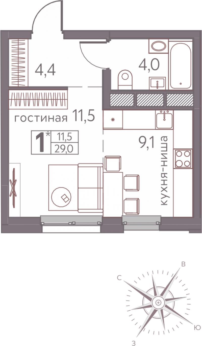 1-комн. квартира, 29.00 м², 4/17 этаж