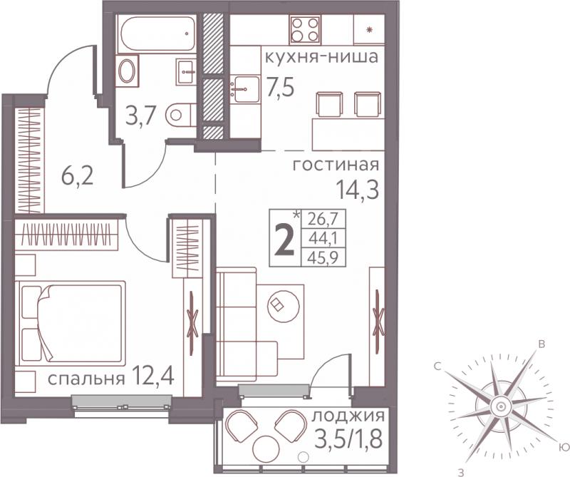 2-комн. квартира, 45.90 м², 8/17 этаж