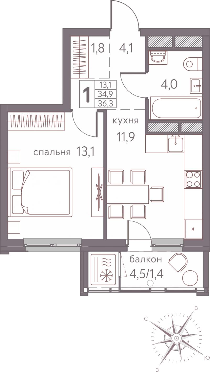 1-комн. квартира, 36.30 м², 4/17 этаж
