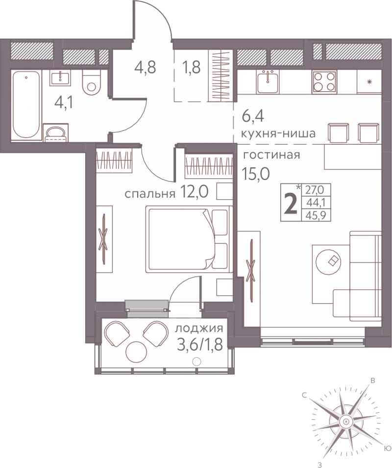 2-комн. квартира, 45.90 м², 3/17 этаж