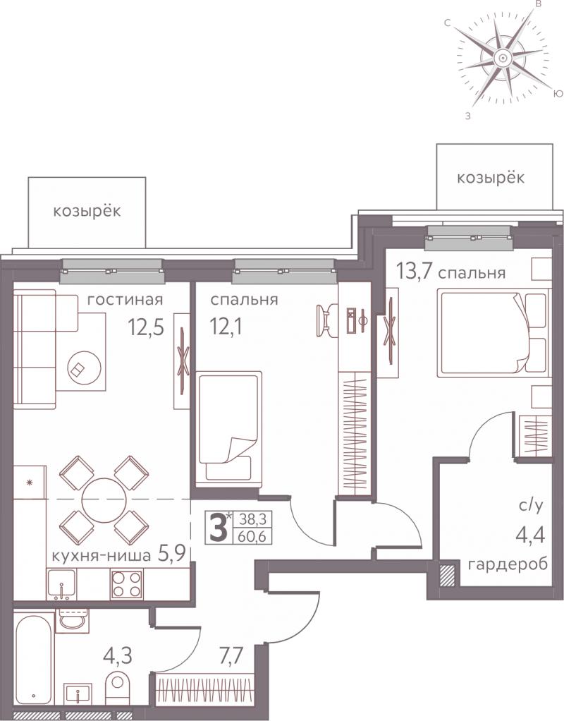 3-комн. квартира, 60.60 м², 2/17 этаж