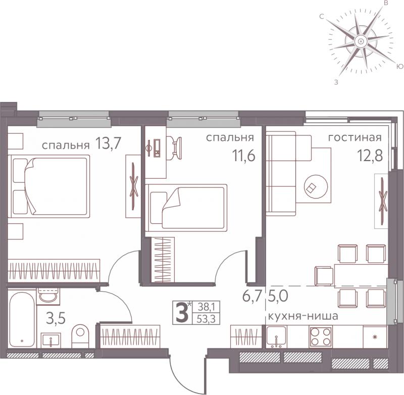 3-комн. квартира, 53.30 м², 3/17 этаж