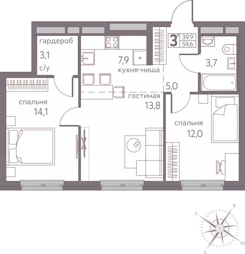 3-комн. квартира, 59.60 м², 3/17 этаж