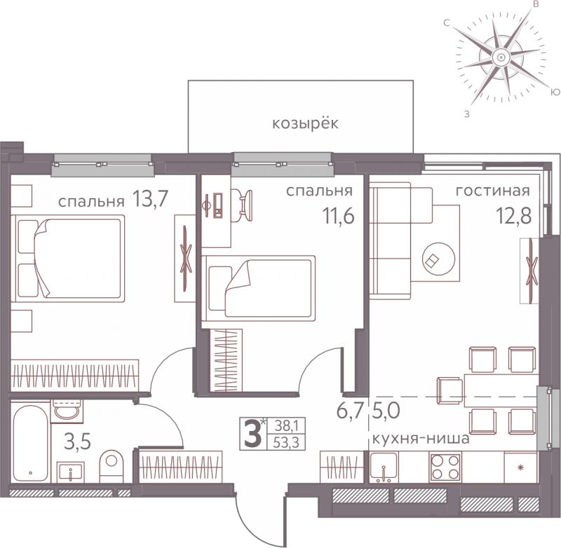 3-комн. квартира, 53.30 м², 7/17 этаж