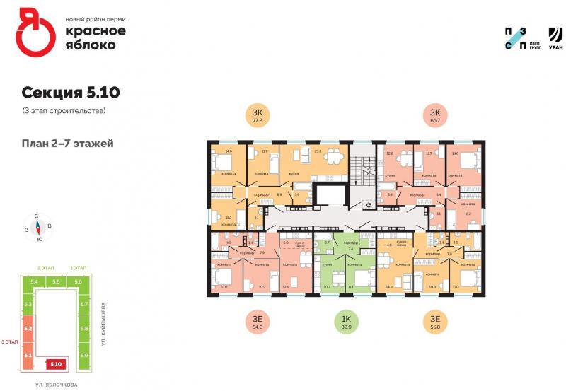 Новый район «Красное яблоко» - ВКУСНО ЖИТЬ!Новый жилой район - «Красное яблоко» - концептуальный проект от группы компаний ПЗСП.Вторая очередь проекта на ул. Яблочкова, 5 (корп. 5) - Три секции переменной этажности- 5.1, 5.2, 5.10**: (18; 15; 7 этажей).Срок реализации проекта: 1 квартал 2026 г.Почему новый район называется «Красное яблоко»?Это оригинальное название, объединяющее микрорайон Краснова и улицу Яблочкова.Новый район создаётся по системе «всё включено» – а это значит, что всё необходимое для жизни уже рядом с домом: детские сады и школы, спортивные площадки, аптеки, собственный бульвар.«Красное яблоко» – универсальный рецепт счастливой жизни.ЖК расположен в Свердловском районе г. Перми, по адресу: ул. Яблочкова, 5.Въезд на территорию жилого дома осуществляется со стороны ул. Яблочкова и Куйбышева.Рядом с домом расположена остановка общественного транспорта «Яблочкова». До Комсомольской площади можно доехать на общественном транспорте за 20 минут , или за 15 мин. на автомобиле.