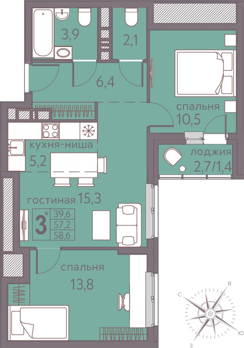3-комн. квартира, 58.60 м², 19/22 этаж
