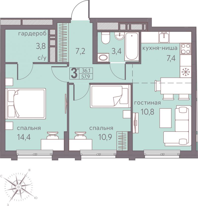 3-комн. квартира, 57.90 м², 4/22 этаж