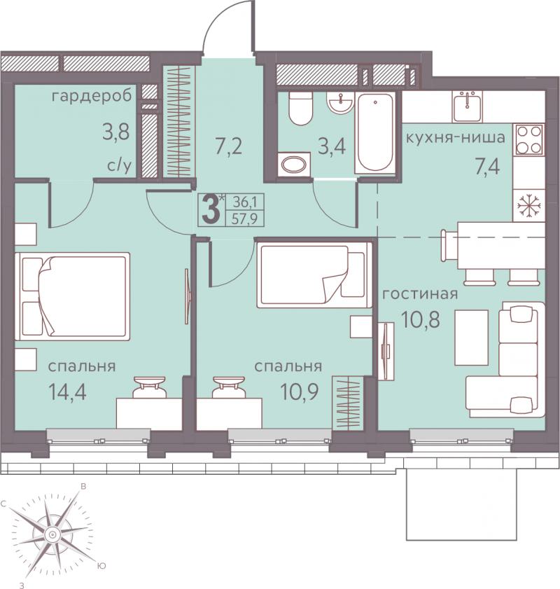 3-комн. квартира, 57.90 м², 2/22 этаж