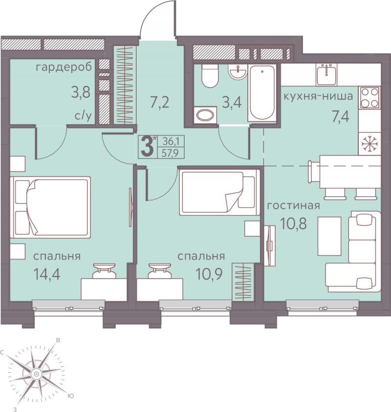 3-комн. квартира, 57.90 м², 6/22 этаж