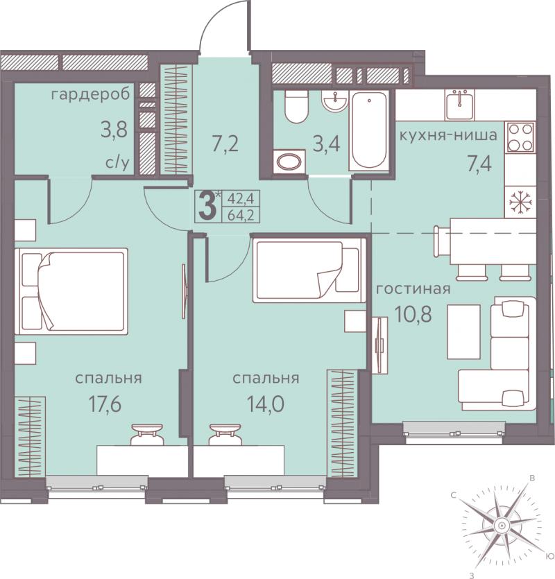 3-комн. квартира, 64.20 м², 8/22 этаж