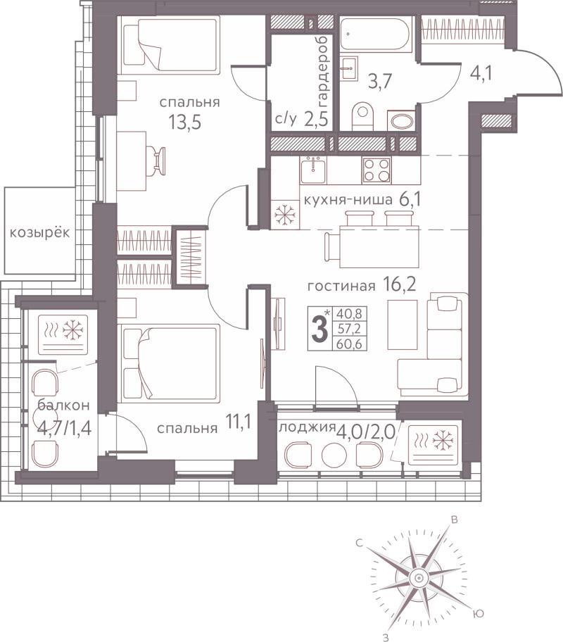 3-комн. квартира, 60.60 м², 2/20 этаж