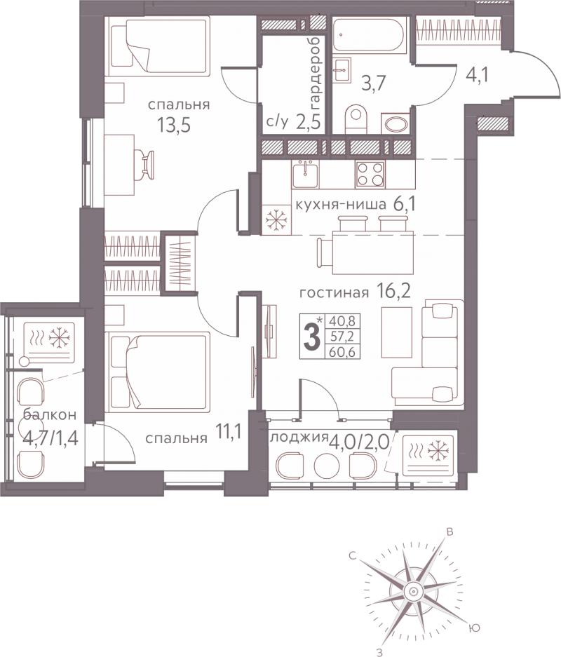 3-комн. квартира, 60.60 м², 13/20 этаж