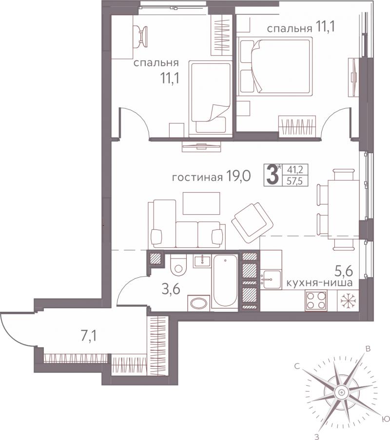 3-комн. квартира, 57.50 м², 5/20 этаж