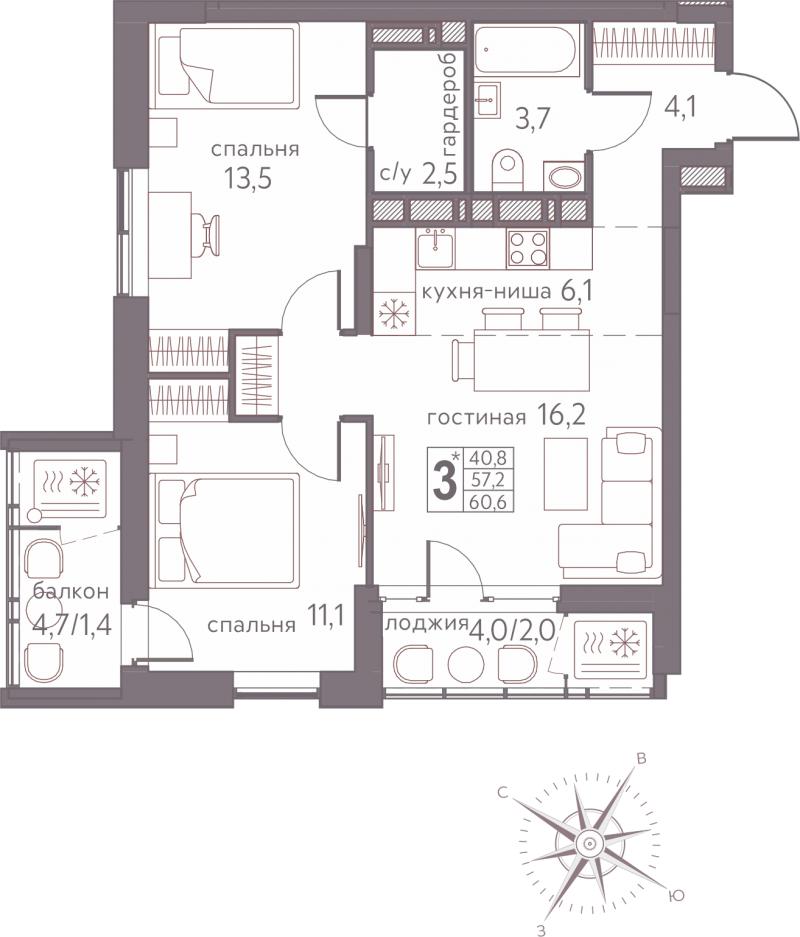 3-комн. квартира, 60.60 м², 14/20 этаж