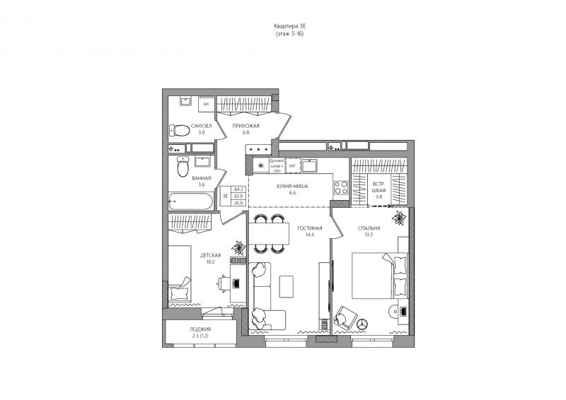 3-комн. квартира, 63.10 м², 15/16 этаж