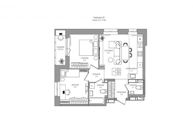 3-комн. квартира, 60.60 м², 4/16 этаж