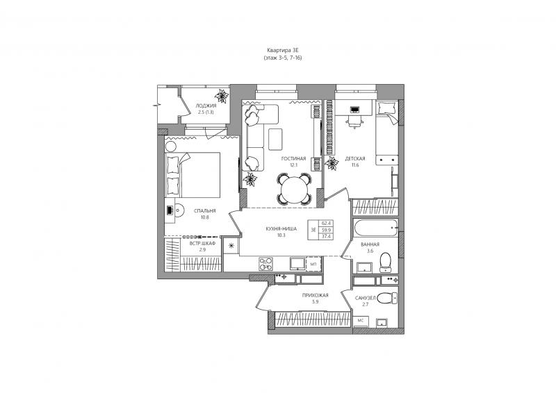 3-комн. квартира, 61.20 м², 3/16 этаж