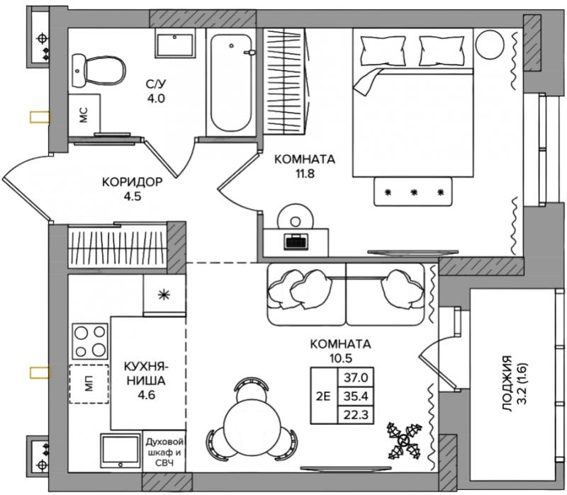 2-комн. квартира, 37.00 м², 16/16 этаж