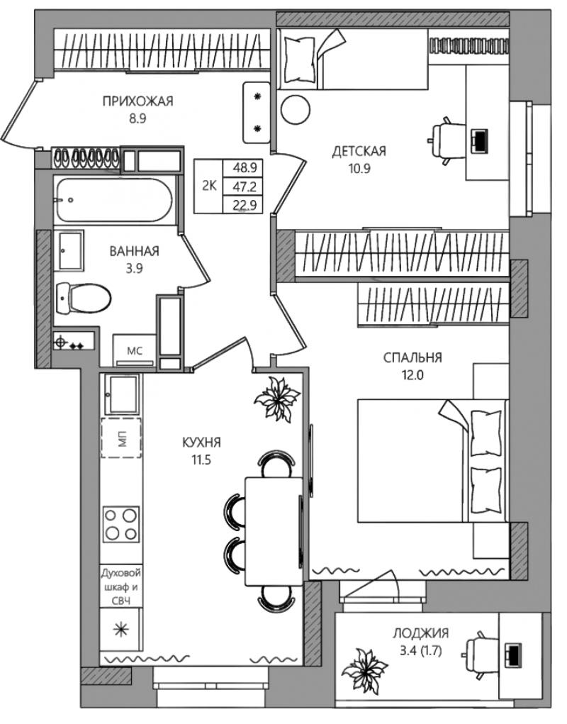 2-комн. квартира, 48.90 м², 11/16 этаж