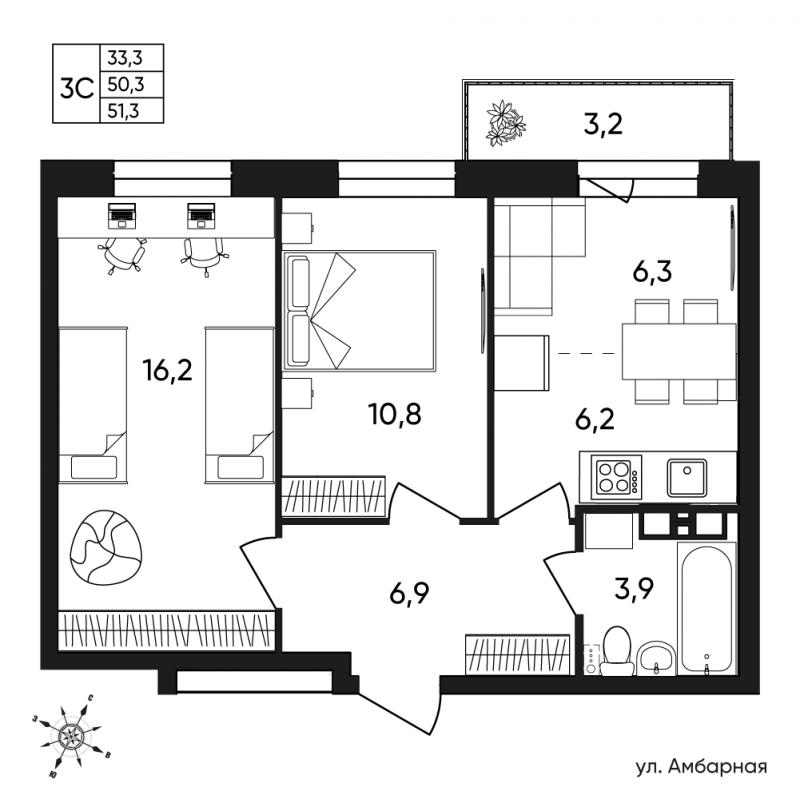 3-комн. квартира, 51.30 м², 4/9 этаж