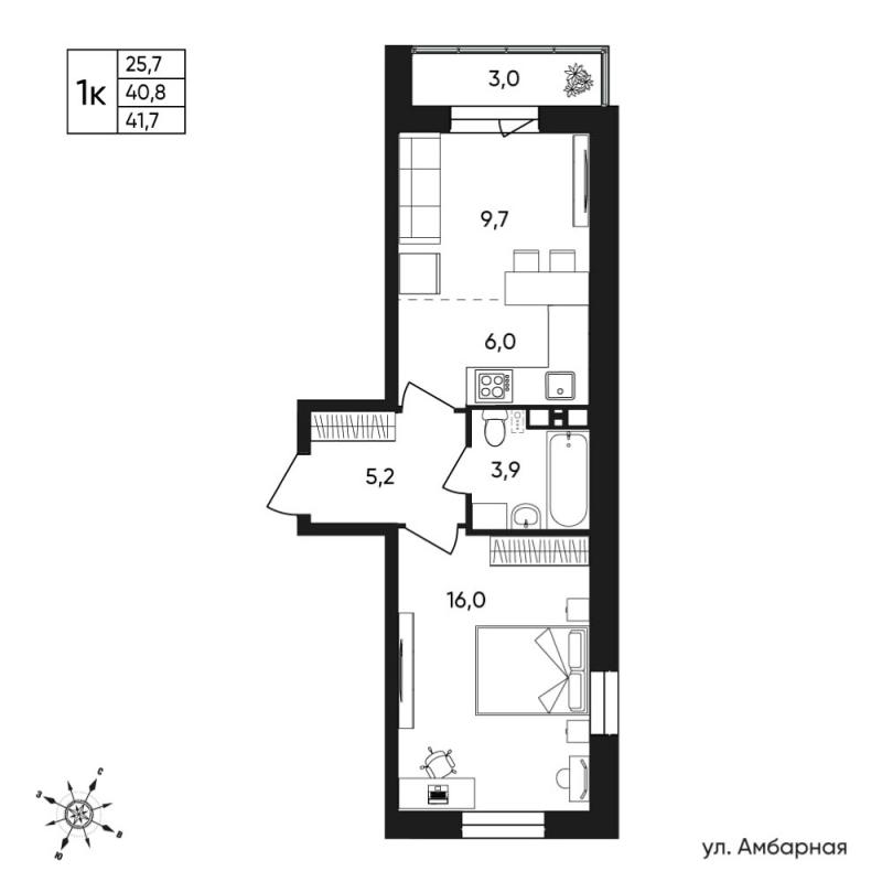 1-комн. квартира, 41.70 м², 4/9 этаж
