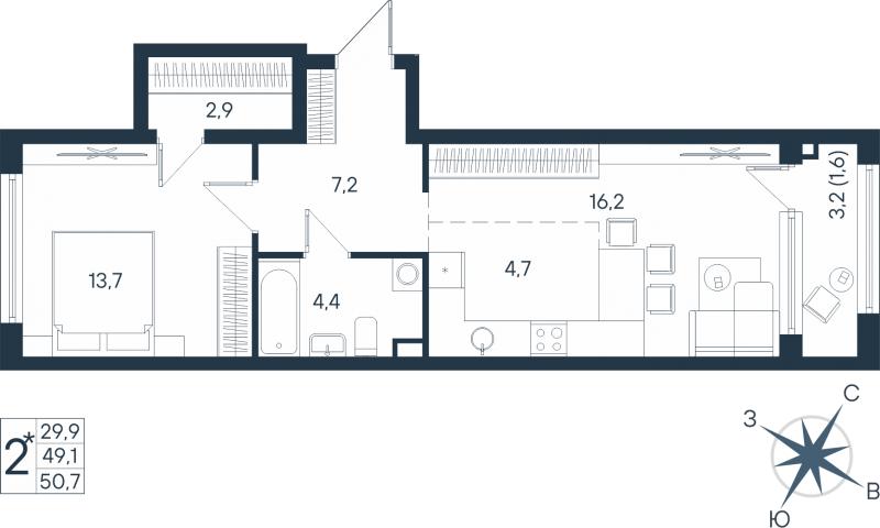 2-комн. квартира, 50.70 м², 2/14 этаж