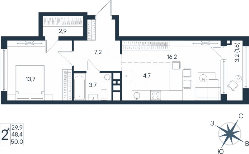 2-комн. квартира, 50.00 м², 9/14 этаж