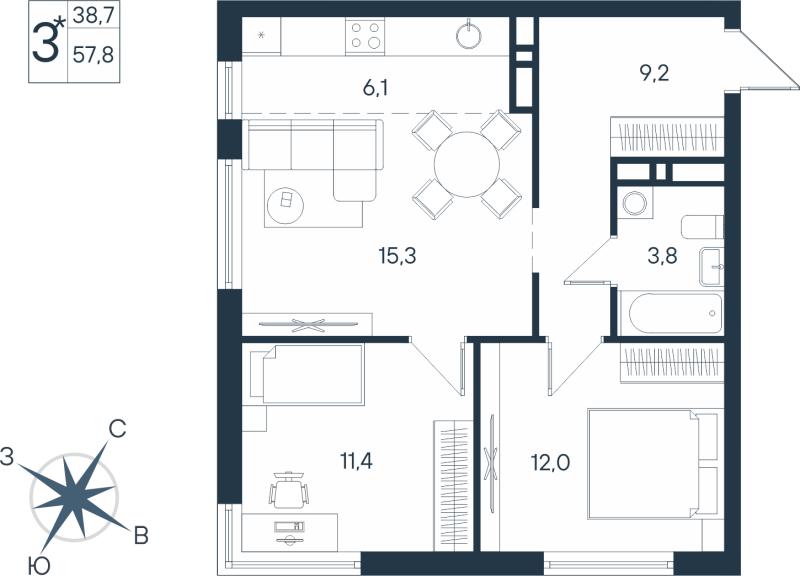 3-комн. квартира, 57.80 м², 10/14 этаж