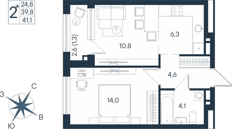 2-комн. квартира, 41.10 м², 11/14 этаж
