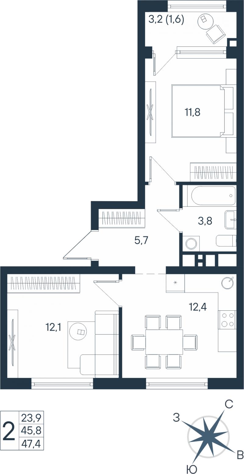 2-комн. квартира, 47.40 м², 12/14 этаж