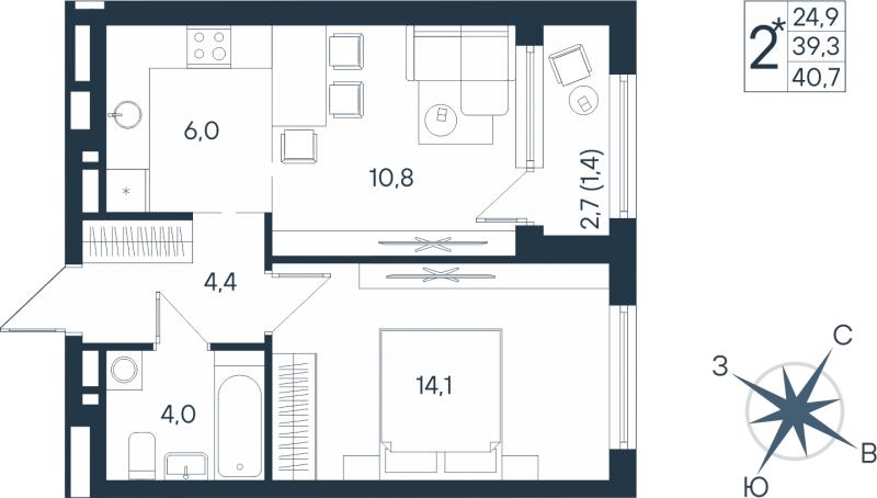 2-комн. квартира, 40.70 м², 12/14 этаж