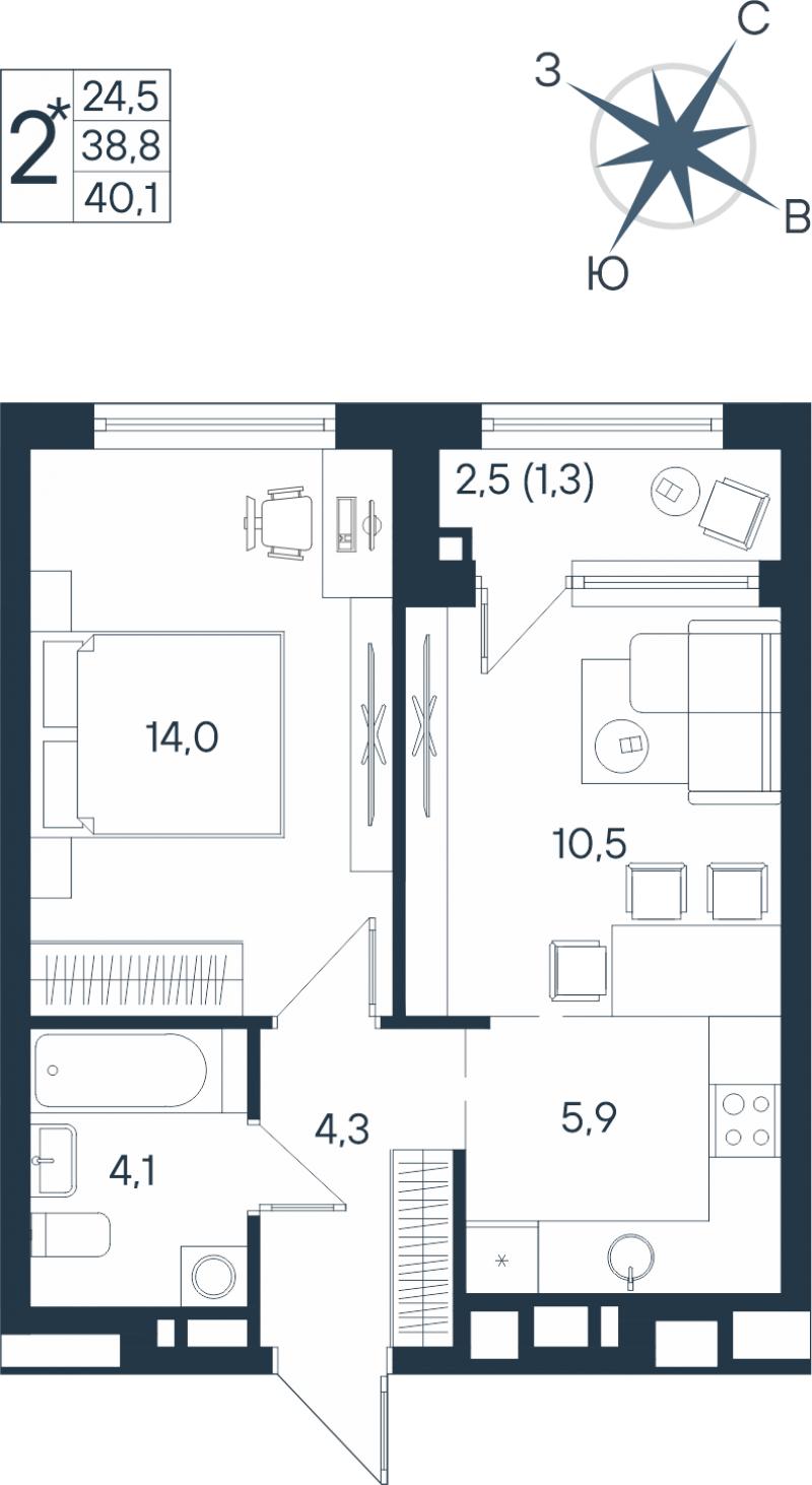 2-комн. квартира, 40.10 м², 11/14 этаж