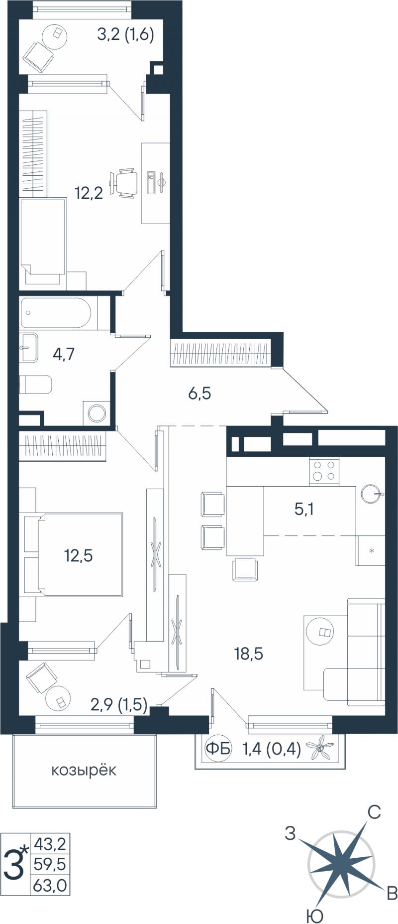 3-комн. квартира, 63.00 м², 2/14 этаж