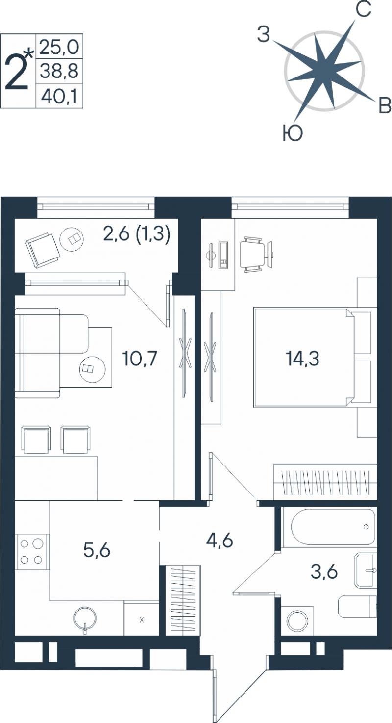 2-комн. квартира, 40.10 м², 10/14 этаж