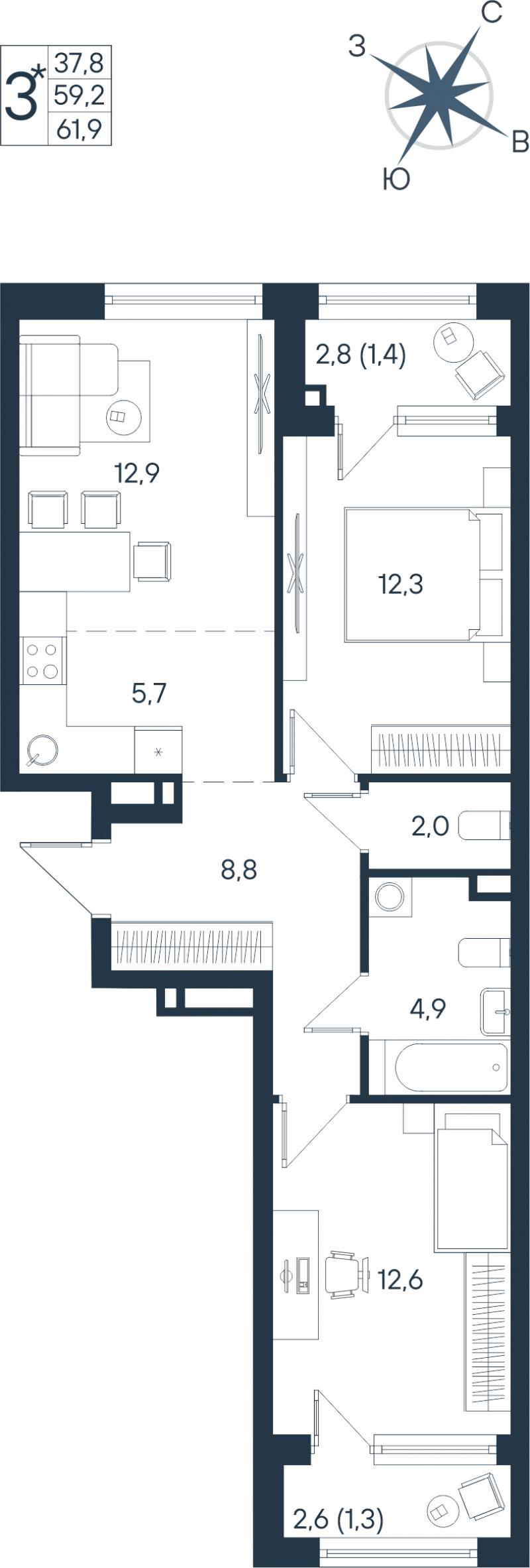 3-комн. квартира, 61.90 м², 2/14 этаж
