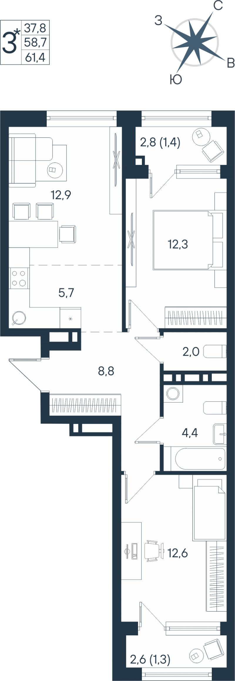 3-комн. квартира, 61.40 м², 3/14 этаж